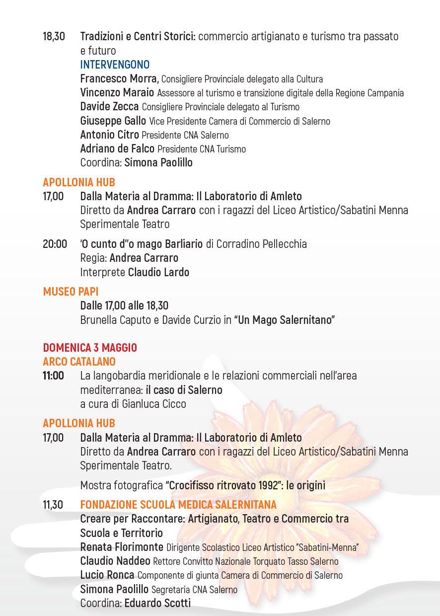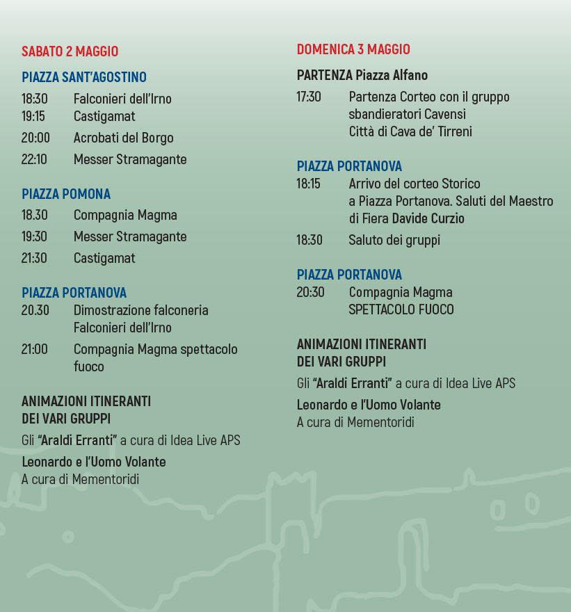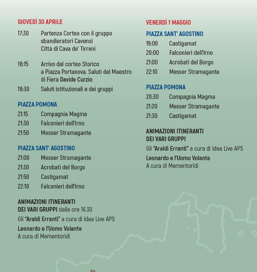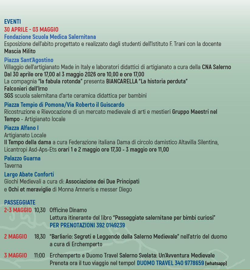 Dal 30 aprile al 3 maggio 2026, Salerno ospita la XXXIV Fiera del Crocifisso Ritrovato, una delle maggiori rievocazioni medievali d'Italia tra mercati storici, falconeria e spettacoli. Il tema "Nel fuoco del tempo" animerà il centro storico con cortei in abito d'epoca, approfondimenti culturali e suggestivi show di fuoco in Piazza Portanova. Un appuntamento che intreccia tradizione e intrattenimento, celebrando l'identità medievale della città in un grande racconto urbano.